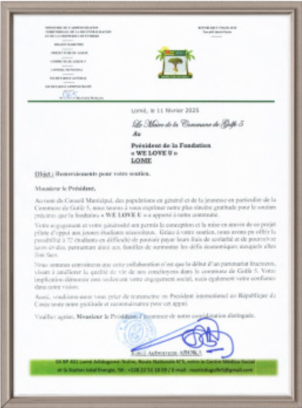 국제위러브유(회장 장길자)가 11월 15일, 토고 로메광역자치지구 아플라오가클리(골프5)시청에서 로메 국립대학교에 합격한 취약계층 가정 72명의 학생들에게 1년 학비 분량의 장학금을 지원했습